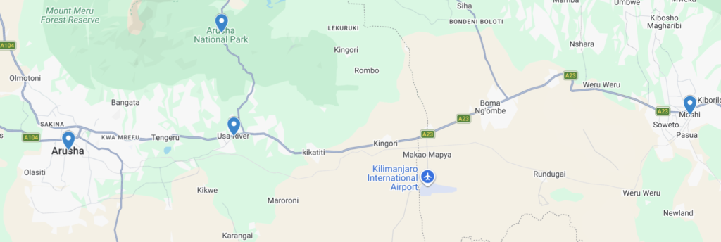 If you’re planning to go on safari in Serengeti, Ngorongoro, Tarangire, or Manyara, I would always recommend to stay either in Arusha town itself or on the western side of it. This is because the famous safari parks are located several hours’ driving to the west of Arusha. Therefore, you can end up driving up to two hours more if you stay in Moshi! That’s far from ideal, especially considering how early you have to get up already to start your safari. Have a look at the map below to understand what I mean.